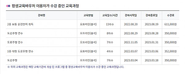평생교육바우처를 사용 할 수 있게 되어서 운전연수를 받으려고 하는데 평생교육바우처 홈페이지 사용기관 정보를 보시면 도로주행연수 7주차,8주차 가격이 35만원으로 되어있던데 현재도 가격이 그렇게 진행되나요?